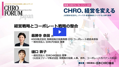 “CHRO”の役割、その核心とは 経営戦略と人事戦略を連動させ、人と組織の力を起点に持続的な成長を実現することが、今あらためて重要な経営テーマとなっている。こうした中で、事業戦略を捉え中長期的な視点で、人・組織の変革を主導するCHROの役割が注目されている。本セッションでは、人事部門の実務責任者とは異なり、人事戦略を専門で担う“CHRO”のお二人を招き、CHROとしての実態や課題、これからの役割について深掘り、その核心に迫る。